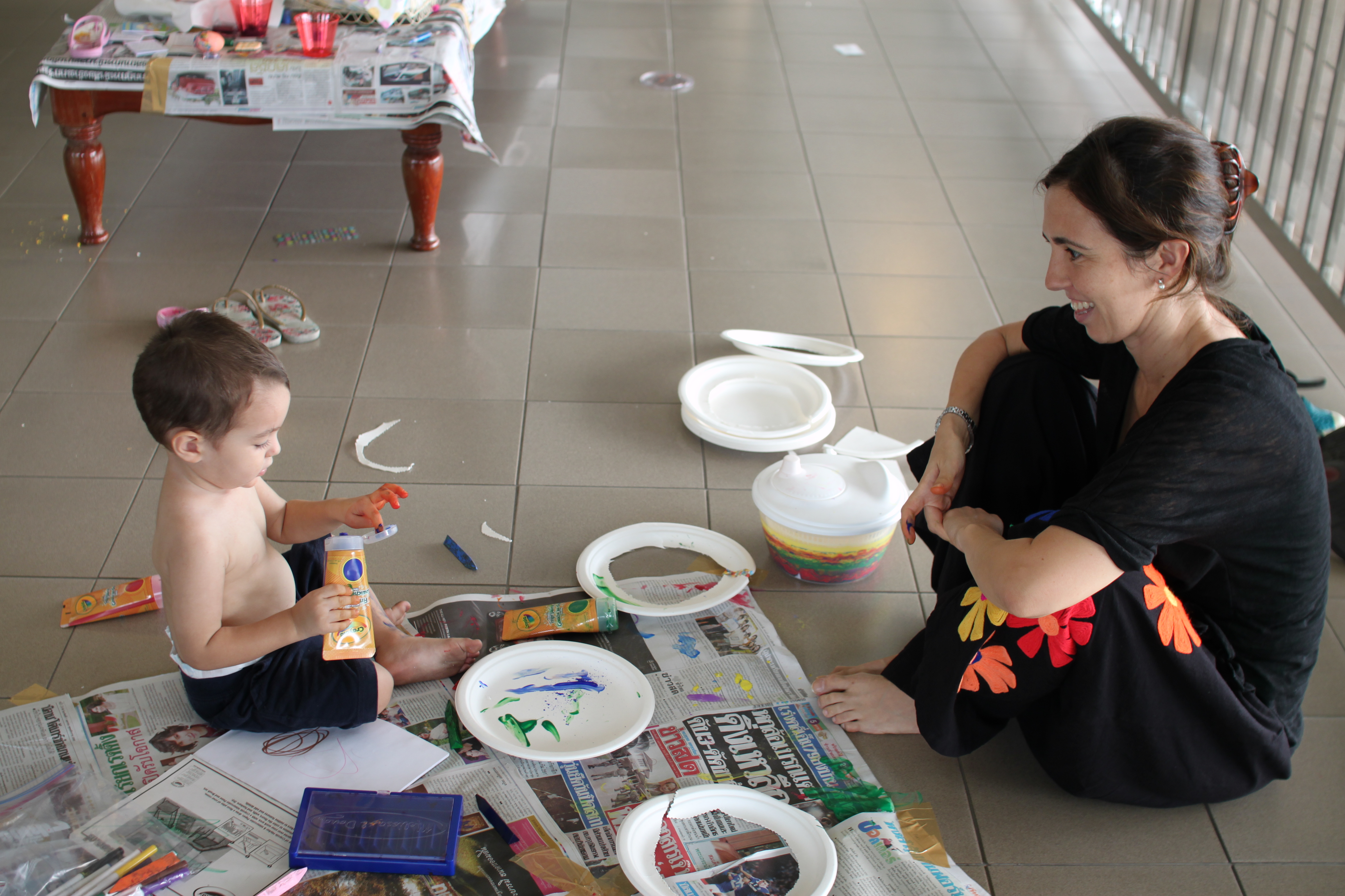 - Marta and Leo make paint salad-spinner eggs on paper plates . . . so much fun!
