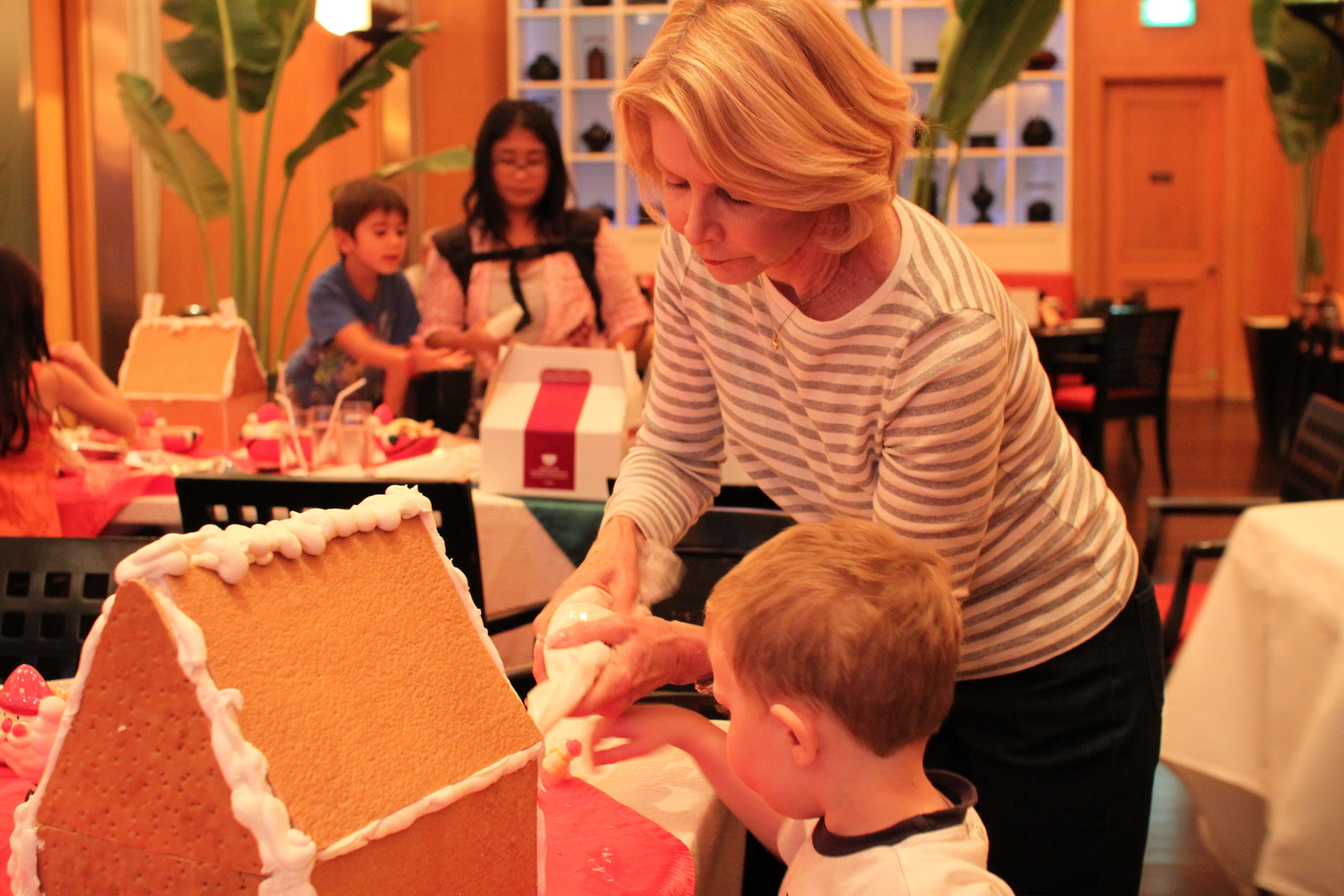 Upon arrival, there was a place setting for each child with a paper box that contained everything that the child needed to construct and decorate his/her house. A friendly — and patient — pastry chef then showed the children and parents how to construct the house around the paper box using gingerbread pieces and loads of icing (note: I think Logan ate more icing than we used to construct the house –which, in both cases, was a HUGE amount). After the chef helped make sure everyone’s houses were stable, children had free reign to decorate their homes with a multitude (I’m talking A LOT) of different types of cookies, marshmallows, candy canes, chocolates . . . pretty much any and all types of candy you can image.