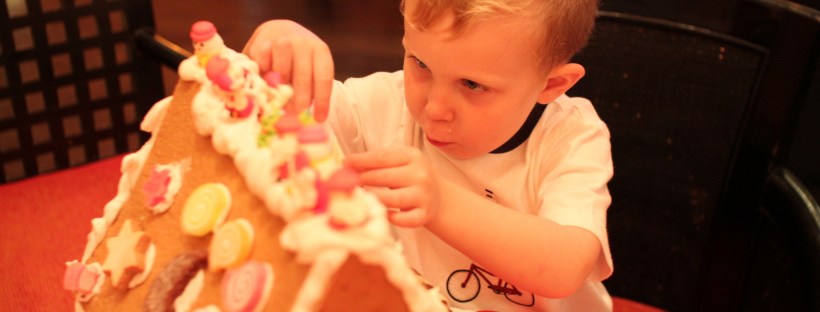 Now, you might be asking why I didn’t just bake my own gingerbread and attempt to construct a house that we could decorate at home. I’ll tell you why. Because me making and constructing a gingerbread house would surely result in an epic Pinterest fail, kind of like this bad boy: Gingerbread Fail. So, to save me a lot of heartache (and my children a lot of disappointment), we made reservations this year to take part in a Gingerbread House Workshop at the Sheraton Grande. It was the perfect holiday activity; not only for Logan, but for his grandmother and for me (and coincidentally, the first time any of us had ever constructed and decorated a gingerbread house).