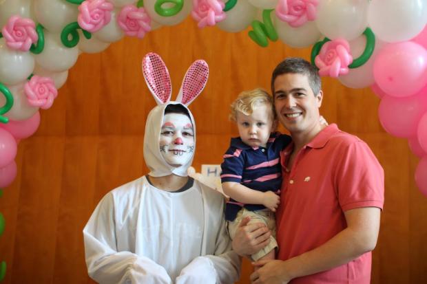 I’m surprised Logan ventured this close to the Bunny for a photo. When Walter tried to hand him over to the Bunny, Logan would have none of it (can you blame him)? After looking at this freakish Bunny, I thought to myself . . . what was the Embassy thinking? Couldn’t they at least get him a real mask? Or a furry rabbit suit instead of the see-through white bed sheet he donned?