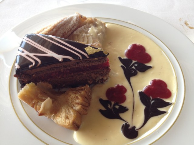 To entice your senses even further, I leave you with a picture of my chocolate and raspberry cake and apple strudel dessert.  The maitre d’ created the artwork table-side. Amazing.