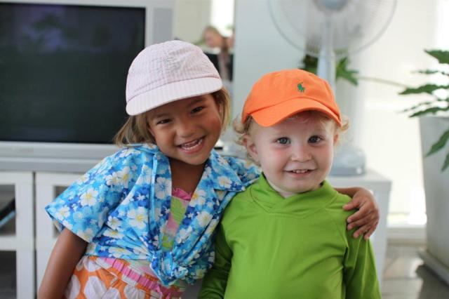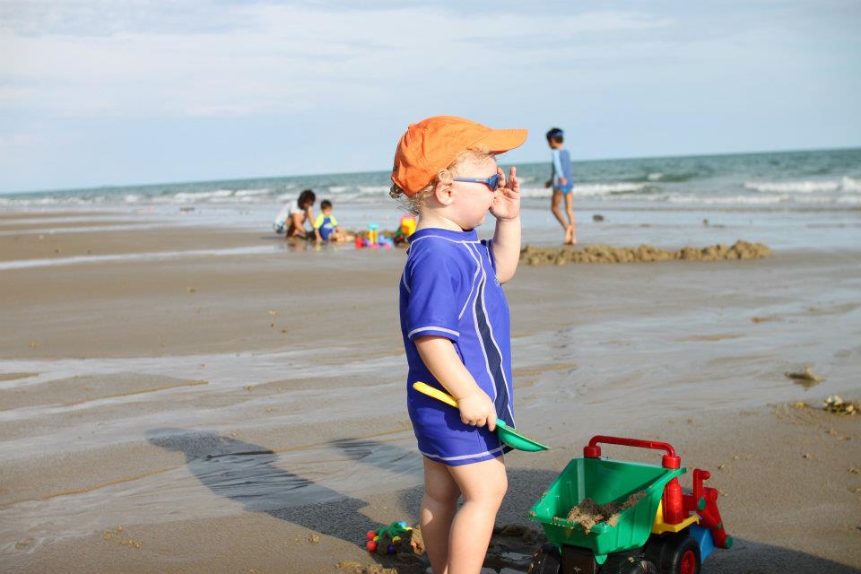 Logan jumps in the "fish pond" at his friend's first birthday party to cool down and enjoys a Songkran spray down in the meantime