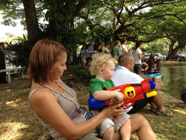 Over the past week, our tod has been learning the joy in what is Thailand’s Songkran Festival – a holiday that Thai families and friends celebrate by visiting temples and splashing water on each other to wish each other good luck, which over the years has evolved into a nationwide water fight and a popular reason to travel and party. Songkran marks the beginning of a new solar year and the summer season in Thailand. It is Thailand’s most anticipated festival every year . In you are in Thailand and you venture out of your abode during Songkran, you and/or your mode of transportation are guaranteed to get wet. Three to five days of nationwide water fights to celebrate not only the new year, but this heat? Brilliance, I say.